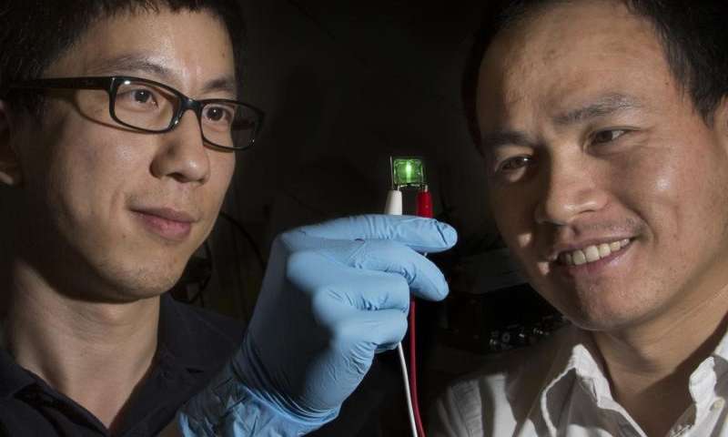 物理助理教授Hanwei Gao(音译:高汉伟)与化学工程副教授Biwu Ma(音译:马必武)正在使用一类称为有机金属卤化物钙钛矿的材料制作一个高性能LED。他们将研究结果发表在《先进材料》杂志上。