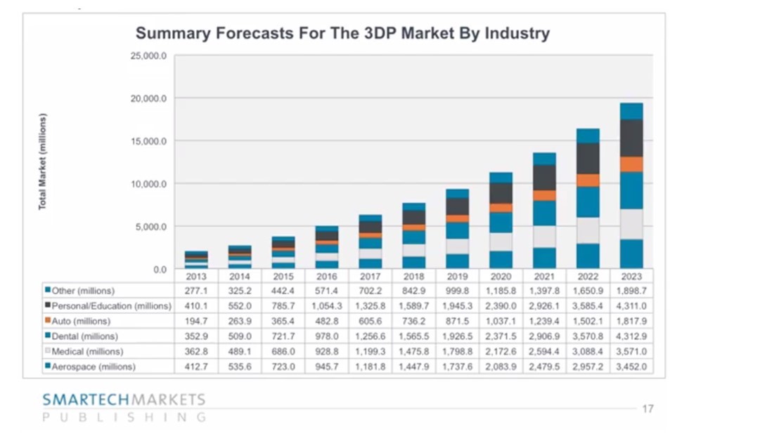 根据2014年沃勒斯报告,全世界的3D打印产业希望其财政收入可以从2013年30.7亿美元上升到2018年的128亿美元,到2020年时希望可以达到210亿美元。2014年沃勒斯报告曾经预测该市场到2021年时有望达到108亿美元。