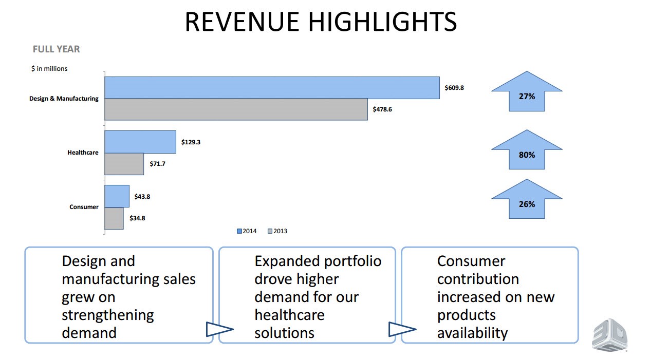 将3D打印系统销售到设计和制造领域的比例从2013年到2014年间增加了27%,其销售额增加到了6.098亿美元;而销售到健康领域的比例则增加了80%,从2013年的7170万美元增加到2014年的1.293亿美元。在去年3D系统的消费者版块增长了26%,从2013年的3480万美元增加到2014年的4380万美元。