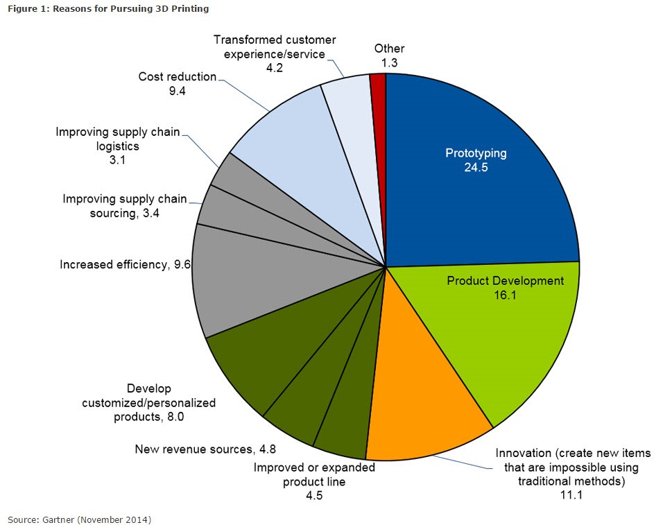 公司对3D打印青睐有加的三个主要原因包括:原型(24.5%);、产品开发(16.1%)以及创新 (11.1%)。最近Gartner公司的研究中,,大约37%的受访者称其公司大约只有一台3D打印机,只有18% 的受访者称大约有10台以上。公司拥有的3D打印机平均数量为5.4。