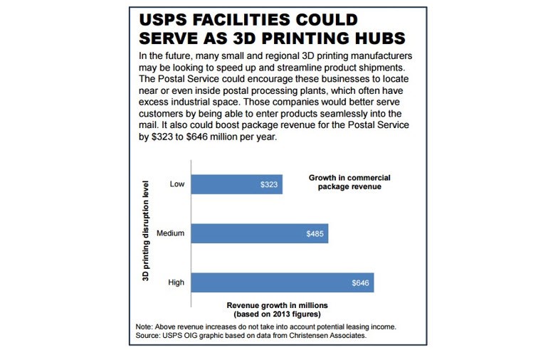 美国邮政服务(USPS)估计,将邮政处理中心变为3D打印中心将会产生6.46亿美元的商业财政收入。这些和许多其他关于美国邮政将如何使用3D打印技术带来革命性的的服务模式的见解可以从《3D打印和邮政服务》报告中获得。