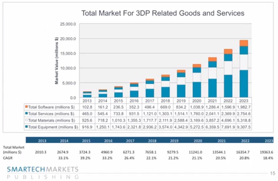 全球3D打印市场在2013年的市值是23亿美元,且有望在2020年达到86亿美元,其复合年均增长率(CAGR)为20.6%。