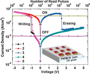 图6.聚合物和氧化石墨烯改性的ITO电极的典型电流/电压曲线。其中曲线1-5分别表示写入-读取-擦拭-读取-重写循环。