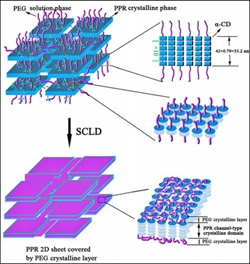 其次,通过在水溶性高分子水凝胶中引入结晶相作为物理交联点和力学增强骨架,制备出了一种基于主-客体包结物的气凝胶——α-环 糊精与聚乙二醇超分子聚准轮烷气凝胶。从结构上看,这种气凝胶是由独特的二维类石墨烯片层三维组装而成;与此同时,通过调节环糊精与聚乙二醇的摩尔配比和 浓度,能够实现片层结构的大小及结晶结构的简单控制。这些研究工作表明,以超分子水凝胶为前驱体,通过超临界流体技术,完全可以制备出一种全新的气凝胶: 超分子气凝胶!由于此气凝胶骨架为不熔的管道结晶结构包覆一层聚乙二醇结晶层,热学稳定性好,且未参与管道结晶的聚乙二醇是一种优异的相变储能材料,因此 获得的超分子气凝胶可作为一种新型多功能的固-固态相变储能材料。也就是说,通过把隔热性能优异的气凝胶材料与相变储能材料有机地融合于一体,在保温隔热的同时,材料自身能够吸收和储存能量,并在合适的时机释放储存的能量,因而能够实现能量的最大化利用(如图2所示)。这项研究成果已经在线发表在美国化学会杂志ACS Nano 上。(DOI: 10.1021/acsnano.5b05281)。
