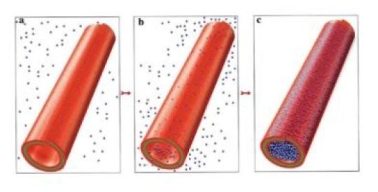 (a)这张照片展示了在饱和溶液中将药物加载到粘土纳米管。(b,c)与药物溶液混合,排出空气并装入药物分子、清洗后管装载完成。