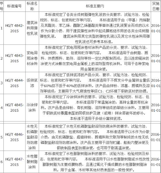 2015年4月,国家标准化委员会发布公告,其依法备案行业标准816项,其中涂料行业标准29项。这些涂料标准于2015年6月1日起正式实施,详细情况如下: