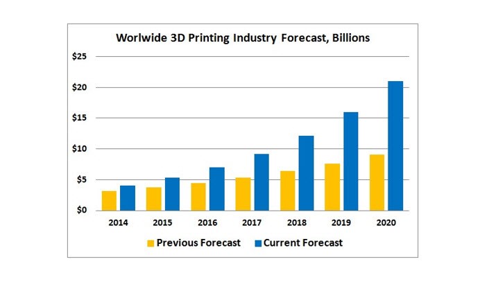 根据2014年沃勒斯报告,全世界的3D打印产业希望其财政收入可以从2013年30.7亿美元上升到2018年的128亿美元,到2020年时希望可以达到210亿美元。2014年沃勒斯报告曾经预测该市场到2021年时有望达到108亿美元。