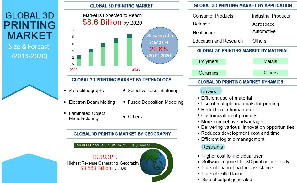 全球3D打印市场在2013年的市值是23亿美元,且有望在2020年达到86亿美元,其复合年均增长率(CAGR)为20.6%。