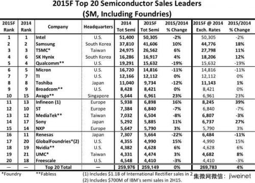 IC Insights 统计的 2015 年全球前 20 大半导体厂商营收排名以及与 2014 年比较