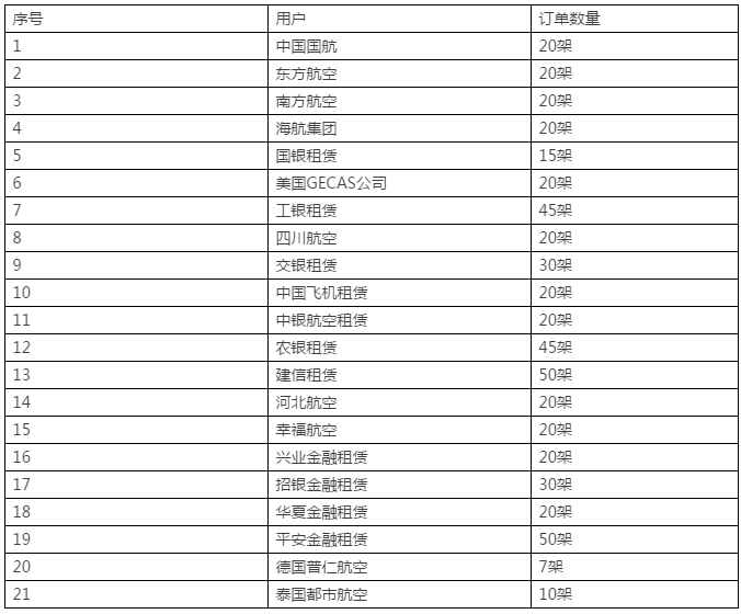 C919大型客机用户达到21家,包括国内用户和国外用户,订单总数517架。