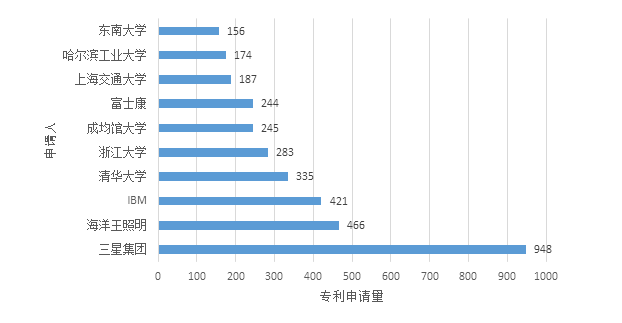 从图3可以看到,韩国的三星集团在石墨烯方面的专利申请数量遥遥领先,直逼1000件,是排名第二的深圳海洋王照明集团数量的2倍左右。美国的IBM公司以421件的数量屈居第三。其它排名前十的申请人中,除了韩国成均馆大学以外都是中国的大学和企业。笔者对深圳海洋王照明集团的相关专利进行初步解读后发现,该集团大部分石墨烯专利都与石墨烯在电池、电容器等中的应用相关,还有不少石墨烯薄膜制备相关的专利,该集团在石墨烯领域的专利布局投入不容小觑。