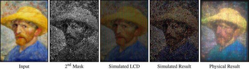 第一个图案创造了一种结构化的光模式,当透过棱镜时,创建一个多彩的副本,然后副本经过第二个图案过滤产生了全彩色图像。这项研究最近发表在23届计算机图形学与应用太平洋会议(2015年计算机图形学大会),赢得了“最佳论文奖”。