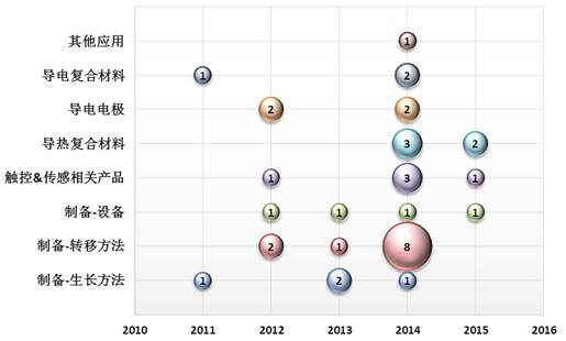 从上图可以看出,格菲电子的相关专利申请中,2013年以前,是以石墨烯制备相关技术为主,2014年后,除在石墨烯制备原有方向上继续研发外,开始扩展石墨烯的应用领域,进一步开发石墨烯的应用。