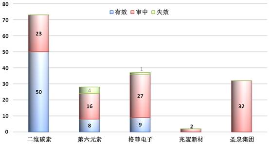 从上图可以看出,二维碳素、第六元素、格菲电子、圣泉集团这四家公司的专利对石墨烯的制备以及石墨烯复合与应用均有涉及,其中,二维碳素的专利申请中与制备相关的有42件,占该公司专利申请的58%;第六元素的专利申请中与制备相关的有19件,占该公司专利申请的68%;格菲电子的专利申请中与制备相关的有19件,占该公司专利申请的51%;圣泉集团的专利申请中与制备相关的有3件,占该公司专利申请的9%。而兆鋆新材与石墨烯相关的专利均与石墨烯复合及应用相关,没有涉及制备方面的专利。可见,二维碳素、第六元素、格菲电子这三家石墨烯专业型公司的技术较为全面,实力较强;兆鋆新材和圣泉集团的石墨烯相关业务是根据企业和市场情况发展而来,其技术更多侧重于与原有产品的结合。