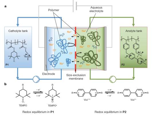 (An aqueous, polymer-based redox-flow battery using non-corrosive, safe, and low-cost materials)