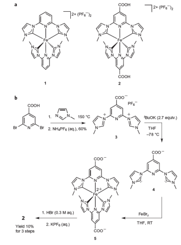 无论在太阳能电池中,还是在光催化剂中,运行时都以光子的捕获或敏化为第一步。稀有金属常常用于这一方面,不过它们却不是大规模应用的理想材料。科学家们投入大量精力来研究用富有金属(如铁)来取代稀有金属,但却未能取得很大进展。 Harlang 等人开发了一种基于铁-氮-杂环-卡宾的敏化剂,这种敏化剂的激发态寿命比传统的铁多吡啶复合物高出上千倍。通过电子顺磁共振、瞬态吸收光谱、瞬态太赫兹光谱以及量子化学计算等手段表征发现,这种铁敏化剂通过 3MLCT 态可将 92% 的光子转化成电子。这一工作打开了利用富有元素制造太阳能转化材料的大门。(Nature Chemistry DOI : 10.1038 / NCHEM. 2365 )