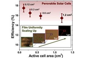 钙钛矿是在太阳能领域引起轰动的一类晶体材料。钙钛矿太阳能电池的生产相对便宜,近年来它的光电转换效率也迅速提升。研究人员已经报道过了与传统硅电池可相媲美的、效率超过20%的钙钛矿太阳能电池。然而,到目前为止这都还只能局限于电池的尺寸在0.1cm2左右——即实验室测试优良条件,这太小了,以至于无法用于太阳能电池板。