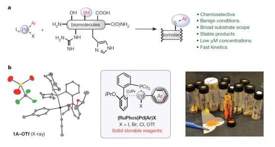 基于过渡金属的催化反应在有机合成中应用非常广泛,特别是在小分子的修饰方面。不过,很少有报道使用过渡金属来修饰复杂的生物分子。这主要是因为生物分子中有多种反应官能团,且反应条件苛刻(如水介质、低温、温和的 pH 值)。 Vinogradova 等人报道了一种新型钯催化剂,可以在生物适宜的反应条件下,高效、高选择性的催化半胱氨酸进行共轭反应。这种钯试剂合成路线简单,具有高度实用性,可以为蛋白质的修饰带来很大空间。生成的产物在酸、碱、氧化剂等条件下都稳定。作者称,这种钯催化剂展示了在合成生物共轭材料方面的巨大潜力。(Nature  doi : 10.1038 / nature 15739