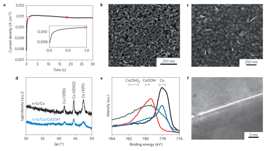 用光电化学法裂解水制氢气和氧气需要有半导体来吸收光子产生电子-空穴对,还需要有催化剂来提高电子在从半导体向溶液中转移的动力。一个重要的问题是,催化剂如何能有效影响半导体中的能带弯曲,进而提高光生电压。 Hill 等人报道了一种简单、廉价的电化学沉积法,来制备用于光催化裂解水的高效的 n-Si/SiOx/Co/CoOOH 光阳极。这个光阳极作为一种固态、金属-绝缘体-半导体光电池,与低过电压的水裂解电化学电池串联在一起。势垒高度与 Co 的覆盖范围相关,厚膜下势垒为 0.74eV ,薄膜下势垒提升到 0.91eV 。这种更大的 势垒使得最终的光生电压提高了360mV。(Nature Materials  DOI : 10.1038 / NMAT 4408