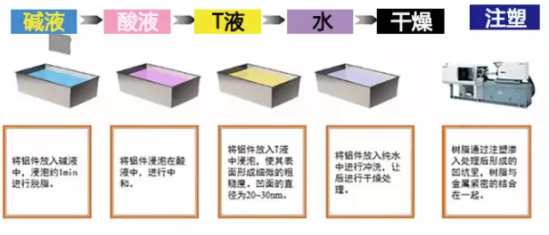 ▶ 使用硬树脂通过注塑进入纳米级的凹坑,使树脂与金属连接在一起;