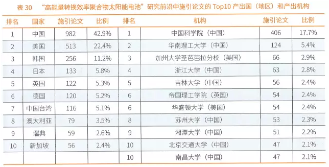 在“高能量转换效率聚合物太阳能电池”和“聚集诱导发光化合物的合成、性质和用于细胞成像”两大化学领域新兴前沿,无论是核心引文数量还是施引文数量,中国都遥遥领先,占有极高比例。中国科学院和清华大学等国内机构,在论文数量排行榜上稳居前列,形成优势地位。