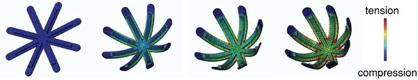 有限元模拟表明莲花状聚合物-聚酰亚胺结构形状演变过程的内部应力分布。