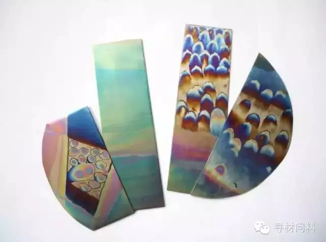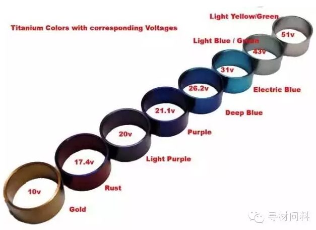 阳极氧化钛的颜色是氧化层厚度不同,对光的干涉不同导致的。而氧化层的厚度受到电压的影响。不同电压阳极氧化钛的颜色