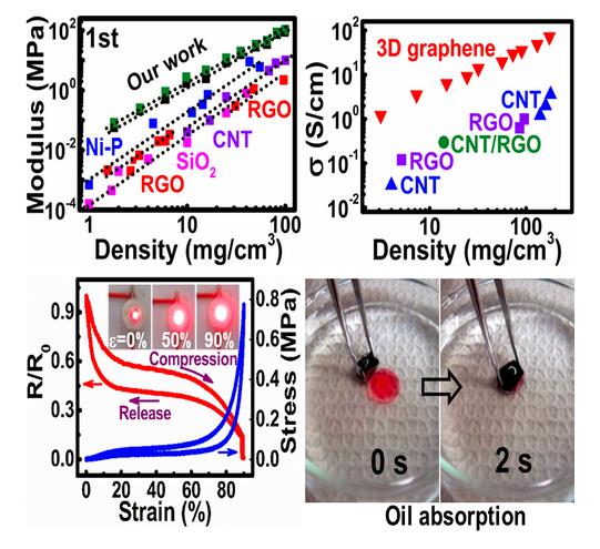 该三维石墨烯管具有高强度,压缩模量可达100MPa,可以支撑自身重量的40,000倍,没有发生明显形变(图2),同时还具有超高弹性,压缩形变95%以上,循环1000次后几乎可完全恢复,为所有cellular materials之最。石墨烯空管材料拥有优异的电导率,电导率可达70 Scm-1,三维石墨烯管可作为性能优异的弹性导体,其力学和电学性能是目前报道的多孔石墨烯的1-2个数量级高,可以应用于新能源领域。此外,该材料具有超疏水特性,吸附有机溶剂超快,吸附有机溶剂达自身重量的600倍以上,可用于污水处理,如海上漏油等。