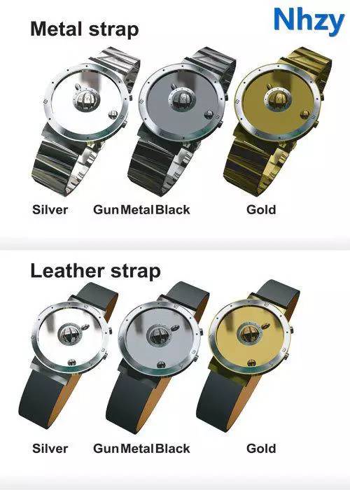 手表还有三种变色,即lver、Gun Metal Black、Gold,与此相配合的还有不同的表带,即金属表带和皮革表带。
