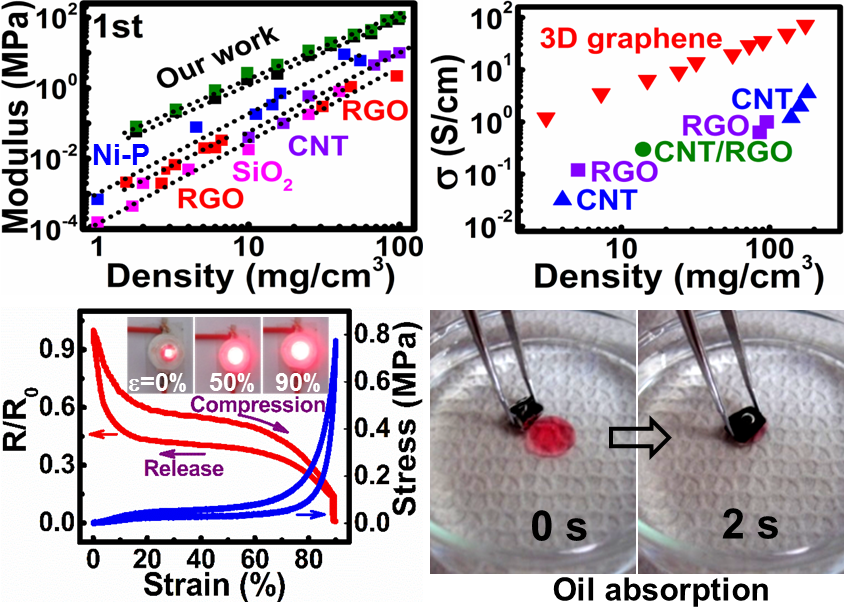 该三维石墨烯管具有高强度,压缩模量可达100MPa,可以支撑自身重量的40,000倍,没有发生明显形变(图2),同时还具有超高弹性,压缩形变95%以上,循环1000次后几乎可完全恢复,为所有cellular materials之最。石墨烯空管材料拥有优异的电导率,电导率可达70 Scm-1,三维石墨烯管可作为性能优异的弹性导体,其力学和电学性能是目前报道的多孔石墨烯的1-2个数量级高,可以应用于新能源领域。此外,该材料具有超疏水特性,吸附有机溶剂超快,吸附有机溶剂达自身重量的600倍以上,可用于污水处理,如海上漏油等。