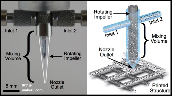 据了解,这项研究是由哈佛教授Jennifer A. Lewis领导的,研究团队采用主动混合和快速开关的喷嘴,可以实现浓粘弹性油墨的打印以及在3D打印过程中同时控制几何形状和组成成份。使用这种方法,所有流体并不是汇集在一个通道里,而是每个流体都有一个单独的入口进入混合室,然后由叶轮以恒定的速度旋转,使其在一种窄间隙中混合。