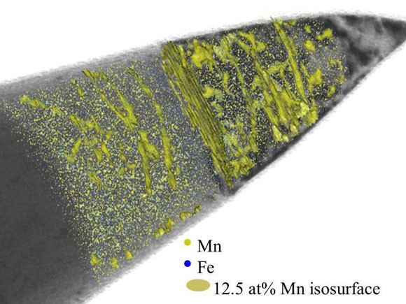 为了确认,他和他的同事首先用铁-锰的样本扫描了一下透射电子显微镜,这使得线状缺陷清晰可见。然后,他们用原子探针断层扫描绘制了样品中原子分布的谱图。然后叠加从两个方法获得的图像,他们实际上的确发现了富锰纳米珠是如何沿着线状缺陷进行分布。