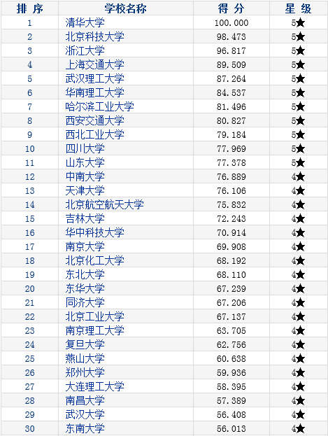 其中,2015-2016年研究生教育分学科排行榜——材料科学与工程TOP30结果如下:
