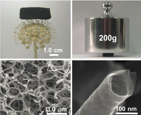 该三维石墨烯管具有高强度,压缩模量可达100MPa,可以支撑自身重量的40,000倍,没有发生明显形变(图2),同时还具有超高弹性,压缩形变95%以上,循环1000次后几乎可完全恢复,为所有cellular materials之最。石墨烯空管材料拥有优异的电导率,电导率可达70 Scm-1,三维石墨烯管可作为性能优异的弹性导体,其力学和电学性能是目前报道的多孔石墨烯的1-2个数量级高,可以应用于新能源领域。此外,该材料具有超疏水特性,吸附有机溶剂超快,吸附有机溶剂达自身重量的600倍以上,可用于污水处理,如海上漏油等。