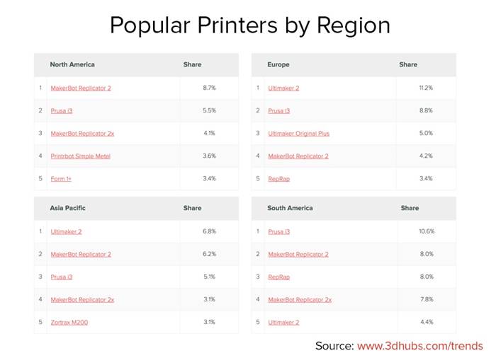 欧洲市场:前五的品牌未出现变化。只有Prusa i3试图增加相对市场份额。