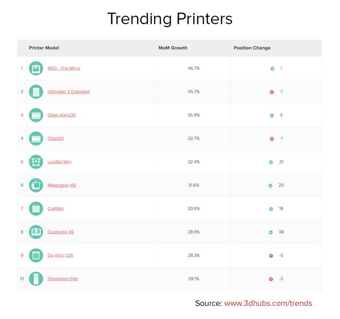 在3D打印机趋势排名中,前两名的位次出现对调。在榜单中,Ultimaker 2 Extended继上月榜首之后,出现轻微下滑,排名第2位。而那个月排名第2的Micr0 3D The Micro逆袭成功,成功登顶。但两者只有1%的差距。