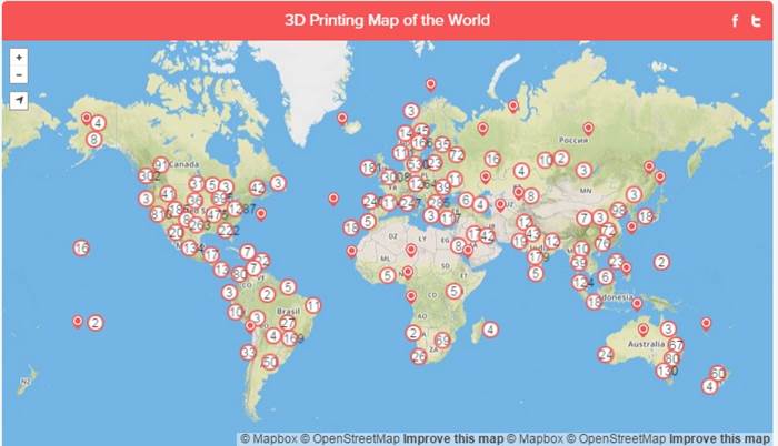 以上地图展示了3DHubs20000多台3D打印机的全球分布,覆盖超过150个国家。