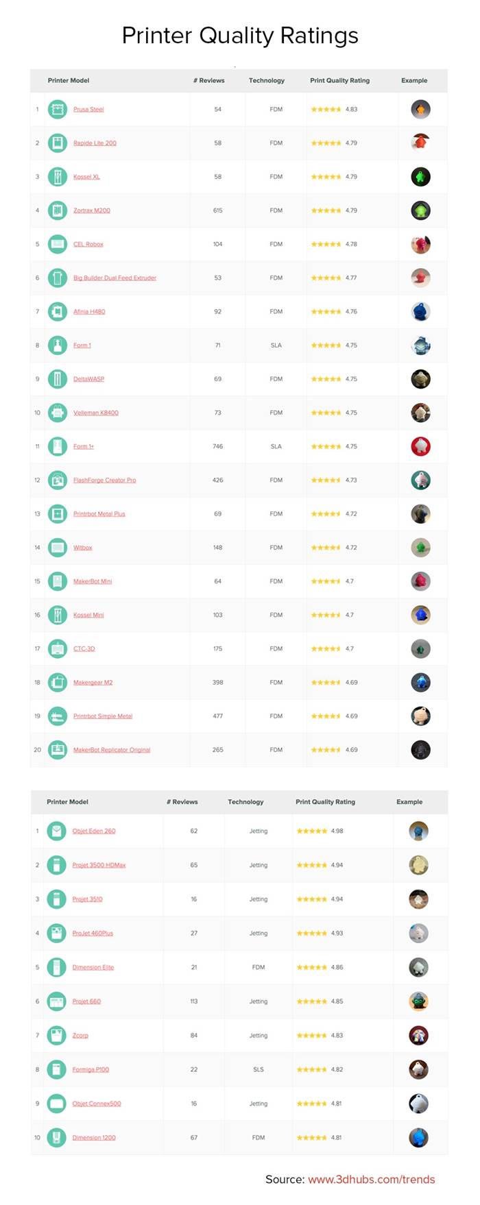 在前10位中,喷射技术的3D打印机占据70%,只有两台Dimension的FDM技术打印机以及一台Formiga的SLS技术打印机。