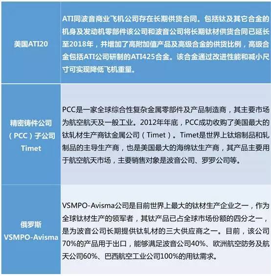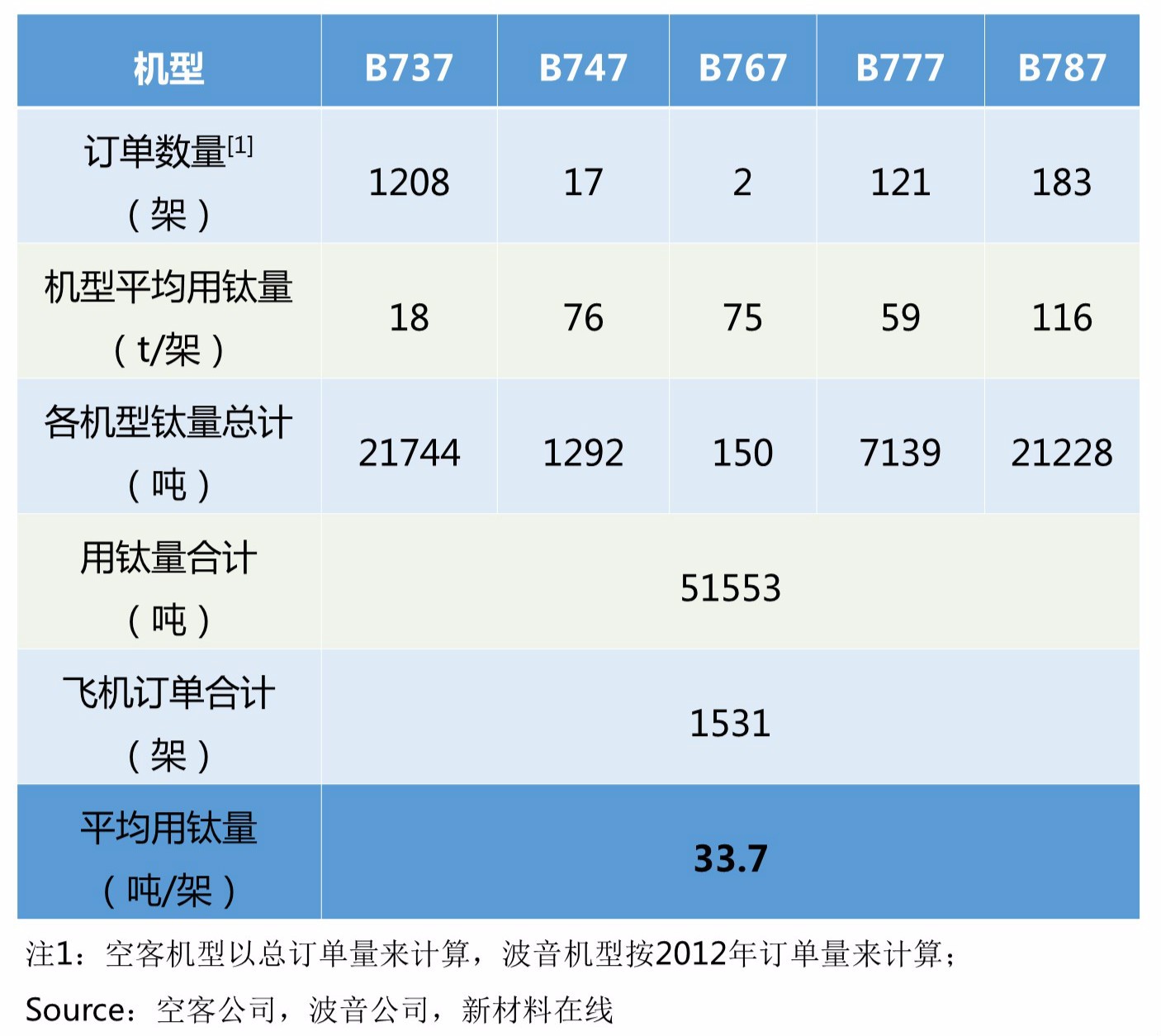 波音公司飞机平均用钛量约为33.7吨/架。以下是波音飞机主要机型的平均用钛量和波音公司在中国的飞机市场预测。
