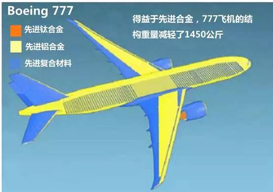 铝合金、钛合金、镁合金都属于轻型合金,通常用于飞机机身材料,尤其是铝合金、钛合金已经成为飞机轻量化的关键性合金材料。波音777型飞机采用先进的合金做结构材料,使机身减轻了1450公斤。