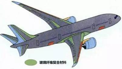 玻璃纤维即玻璃钢,是轻质高强材料,具有耐烧蚀的性能。玻璃纤维复合材料可用作飞机的机翼及其前后缘、尾翼、地板梁和后承压框以及机身蒙皮等。轻质材料,大幅度减轻飞机的重量。波音787客机大量采用玻璃纤维复合材料,占到飞机结构总重的5%,被很多人称之为“塑料飞机”。该复合材料具有更好的耐腐蚀性,这使得提高客舱湿度成为可能,使每一次飞行变得更加惬意,这就是为什么波音787会成为“梦想客机”。
