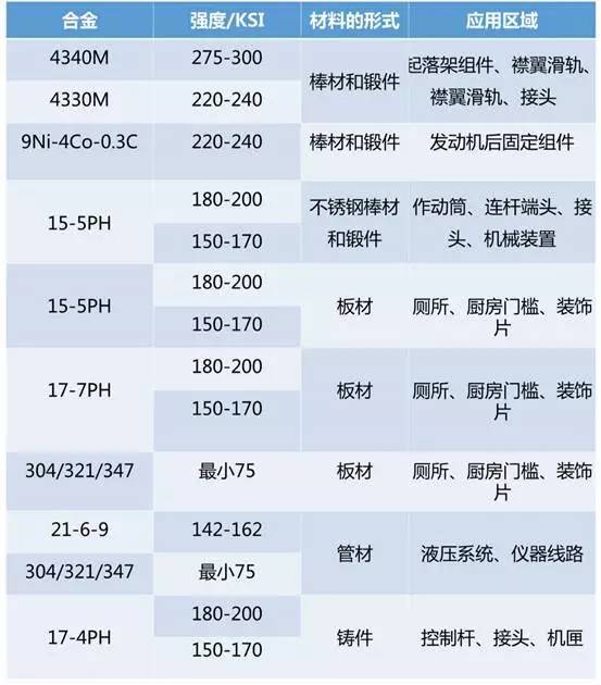 民用飞机的制造材料主要是铝合金,其次是合金钢。飞机上使用最多的合金钢是调质钢,用在起落架、连接件、发动机吊架、大梁、螺栓等。以下是波音公司常用的合金钢列表。