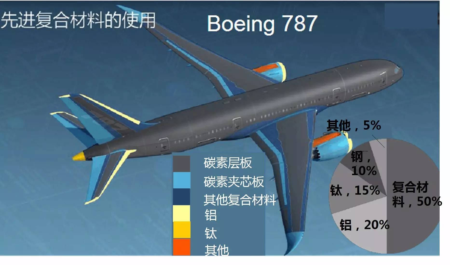 波音787复合材料构件重量占全机结构重量的50%左右,是迄今为止复合材料用量最多的一个机型:其机身、机尾翼采用碳纤维层合结构;而升降舵、方向舵却保留了过去采用的碳纤维夹芯结构;发动机舱除受力大的发动机吊架外均采用碳纤维夹芯结构;整流罩采用玻璃纤维夹芯结构。