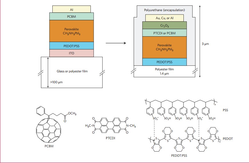 1.超薄太阳能电池。典型P–I–N钙钛矿太阳能电池示意图(左图)Kaltenbrunner和他的同事们设计的超薄钙钛矿太阳能电池(右图)。聚(乙烯二氧噻吩):(苯乙烯磺酸盐)(PEDOT:PSS)是透明空位选择性电极,N,N'-二甲基-3,4,9,10-四羧基苝二酰亚胺(PTCDI)6,6-phenyl C61丁酸甲酯(PCBM)作为电子传递层,Cr2O3层使设备在空气中操作稳定,金、铜或铝用作反射电极。氧化铟锡(ITO)透明电极用于典型P–I–N结构。图片下部显示是空穴传输材料PEDOT:PSS和电子传输材料PCBMPTCDI的化学结构。