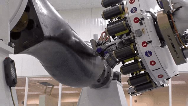 缠绕在机械臂卷轴上的是碳纤维线丝,这是由美国宇航局的工程师们设计的结构松散的机械手臂造型复合部分。该项目的一名工程师Justin Jackson指出,这是有史以来最大的综合机器人之一,可以制备26英尺宽的产品,完全可以作为“史上最大的制备太空交通工具的复合结构。”