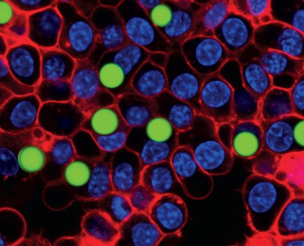 两组研究人员分别在活细胞中制作出微型激光。它们可能听起来像是蚁人下一个对手的武器,但显微激光可以大大提高生物学家能力,用来追踪单个细胞的运动。激光由直径为几微米的、掺杂了荧光染料的塑性小球构成,细胞通过内吞作用吸收小球。另一个小组也使用染色的天然油滴脂肪小球。当荧光分子被激发,小球与特定波长的光发生共振,就像管风琴在基频范围与声音发生共振一样,产生倍频。如果光的强度超过某一阈值,光就会刺激染料使辐射更强烈,产生激光。因为每个小球发射出的波长不同,内置的激光可用来识别并记录单个细胞。当它们响应化学刺激而发生迁移时,内置激光可能会立即用来记录免疫细胞的培养过程。如果可用于活体组织,它们最终可能可以追踪胚胎、免疫系统或癌变肿瘤中的细胞变化。