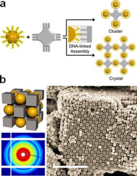DNA连接的纳米颗粒装配的形状诱导定向键示意图. b)可预测的大范围三维二元晶体构造和晶格对称性,由立方体形状与立方体与球体之间的DNA交互作用决定(标尺:500nm)