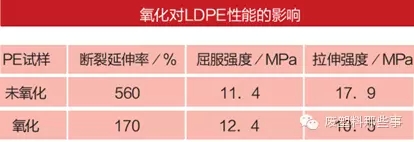 聚乙烯在无氧状态下在200~290℃会发生交联和链剪断反应,但是温度高时,以剪断为主。交联反应与叔碳原子有关,叔碳原子多少决定着交联反应发生的难易程度。低密度聚乙烯比高密度聚乙烯易发生交联反应,这与分子链上氢原子被抽提的难易程度有关。支化PE的支化程度高,其分解速率高。在氧存在下,支化聚烯烃也比线型聚烯烃更易氧化。聚烯烃氧化后性能显著降低,1gLDPE树脂与5 X 10-7g氧反应后的性能变化如下表所示。