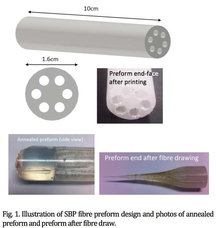 悉尼大学的研究结果发表在OSA的《光学通讯》杂志,研究团队实际上利用了FDM 3D打印技术来制作拉拔光学纤维的预制棒。由大学的跨学科光子学实验室(iPL)John Canning教授领导的团队,首先使用Autodesk Inventor软件设计预制棒,然后使用来自澳大利亚Deltastine打印机供应商的Redback-2打印预制棒。作为光学器件的研究人员,材料必须经过仔细挑选,所以他们选择了一种被称为SBP的商用透明丝,一种由苯乙烯-丁二烯共聚物和聚苯乙烯组成的改性ABS。就像OSA论文中所描述的,使用 SBP因为其透明性,灵活性,且当被扭曲时不会变色。