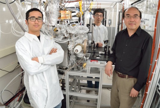 ((从左至右)物理学和天文学博士研究生Faran Zhou;刚刚获得物理学和天文学博士学位的Terry Han;物理学和天文学副教授Chong-Yu Ruan。他们是开发出这种超高速显微镜团队的一部分,其能使研究人员能够查看材料被激光脉冲所引起的变化。图片来源:Harley Seeley。)